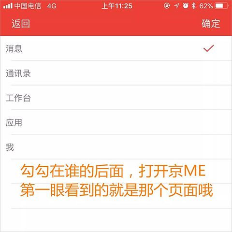 2、应用默认首页——消息页可修改,“消息、通讯录、工作台、应用、我“五选一,自定义。