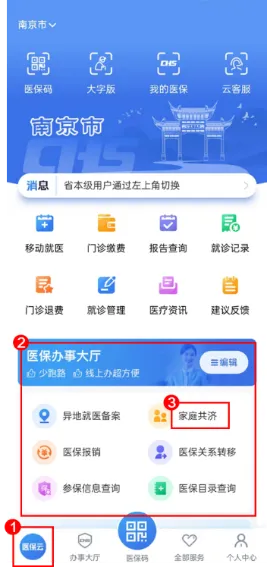 1.打开“江苏医保云”APP,可通过以下三种方式找到【家庭共济】页面: