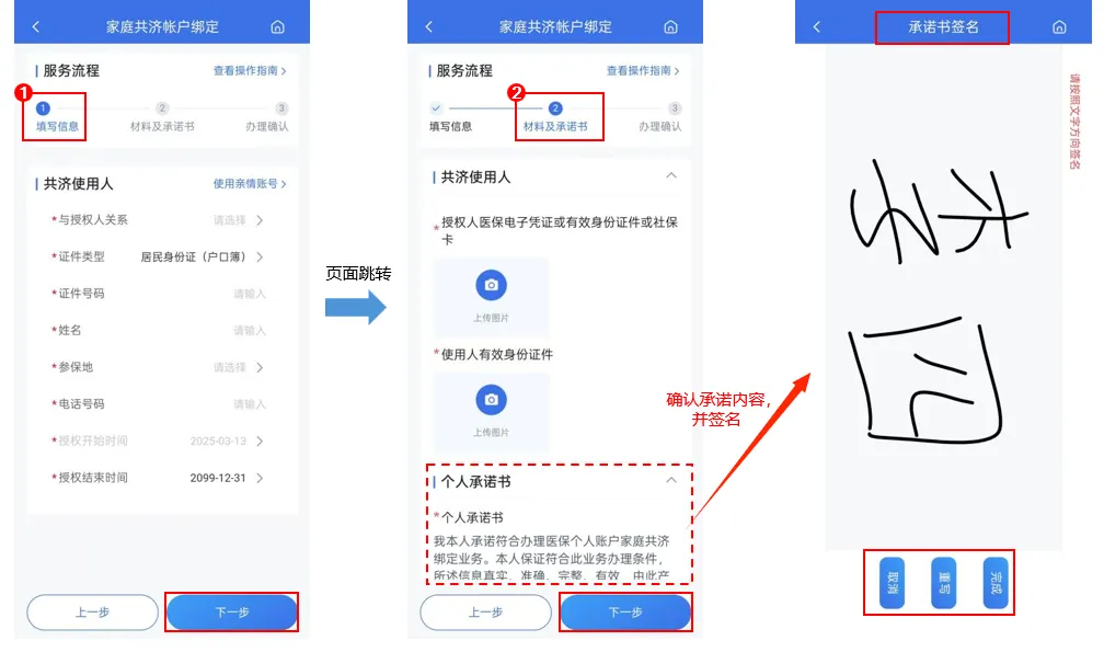 4.在【家庭共济绑定】页面,您将作为授权人,根据页面提示填写共济使用人的基本信息,包括与授权人关系、证件类型、证件号码、姓名、参保地、电话号码、授权开始与结束时间,填完之后点击【下一步】;根据页面提示补充附件材料,并录入电子签名,提交即可完成绑定。