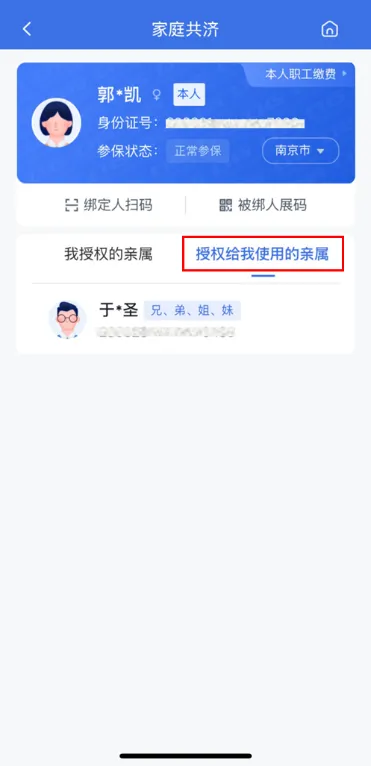 2.进入【家庭共济】页面后,默认展示当前【我授权的亲属】信息,点击切换展示【授权给我使用的亲属】信息