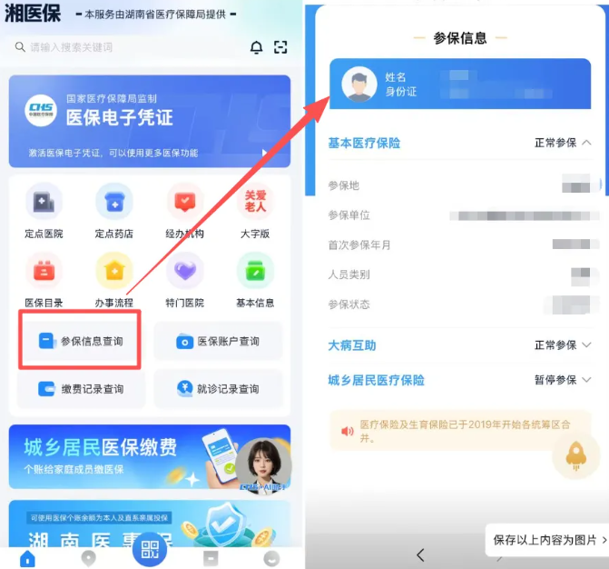 登录“湘医保”平台,首页点击【参保信息查询】,确认参保状态是否为“正常参保”,可查看参保地、参保单位、首次参保时间等基础信息;