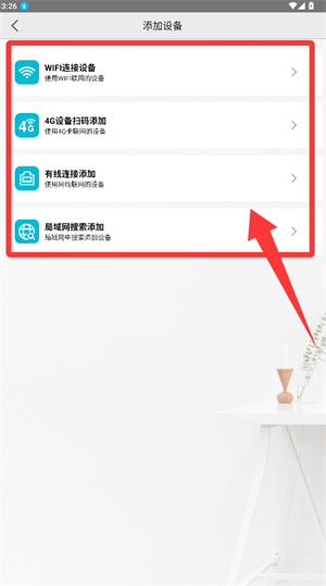 2、在连接方式界面,选择扫码、有线等匹配的添加模式。