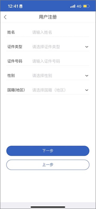 在app导航栏选择“我的”,点击立即登录,选择用户注册,填写姓名、证件类型、号码性别以及地区。